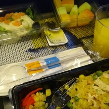 お食事ですが、往路は非常に美味しく頂けました。そぼろごはんやチキンピラフ(かな?)、そうめんが美味しい~!フルーツも甘く、パンもいい香りで大満足です☆ おかきも添えられていて嬉しかったです。
