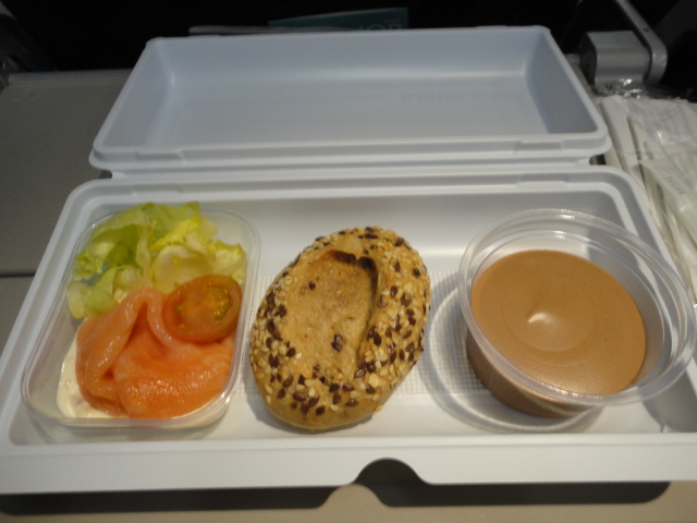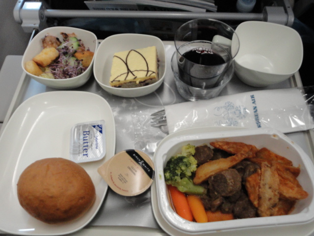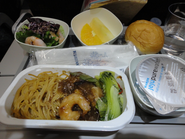 機内食は3種類からのチョイスでボリュームもありました。それとは別にリクエストベースでカップラーメンもあります。ワインは赤・白でフルボトルから注いでくれます。