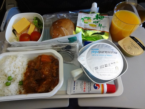 大韓航空の機内食は辛いと有名でしたが、さほどではありませんでしたよ。