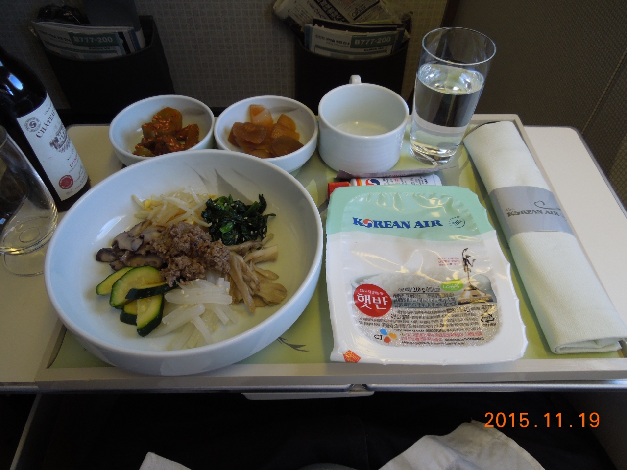 機内食はいろんな写真でみていたビビンバを頼みました。KEですからやっぱりこれでょ!