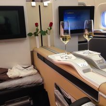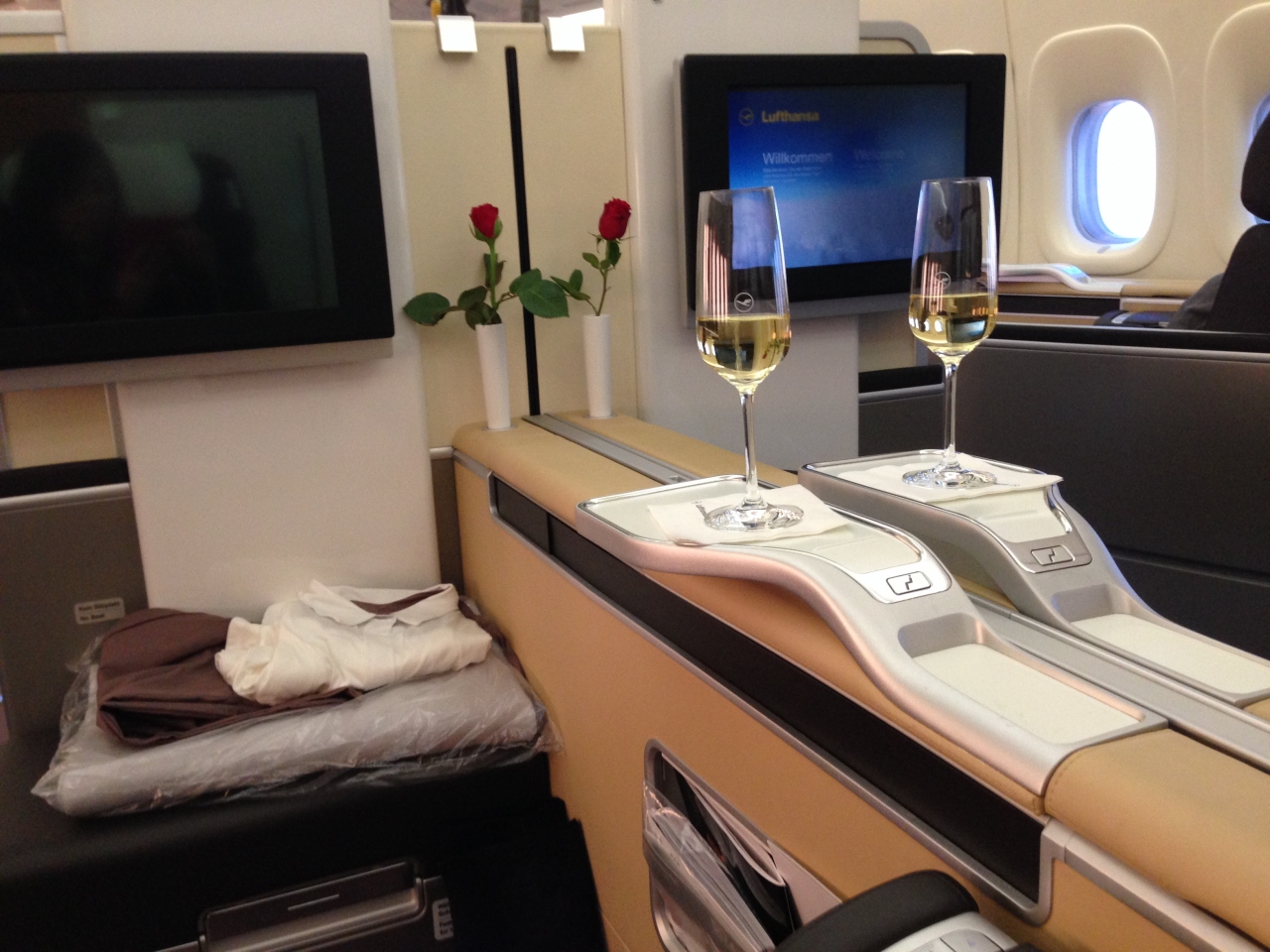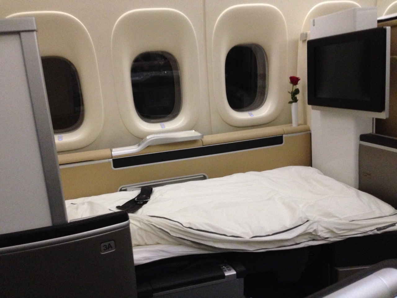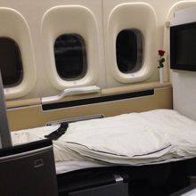 羽田でもラウンジは、ANAスイートラウンジを使用します。シートは、完全水平フラットシートですが、多少凸凹しているのと、やや幅が狭い感じがします。カップルや夫婦で乗る際には、後方真ん中の座席であれば隣同士で座れます。
