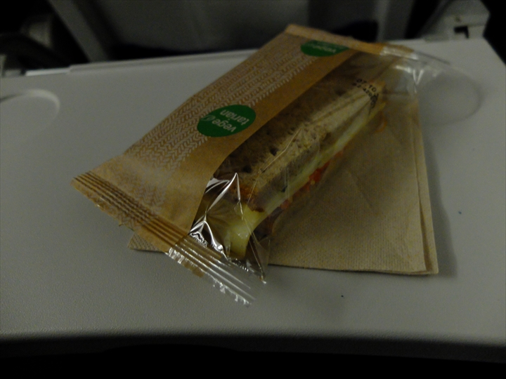 夕方の出発で到着は夜になる時間帯のフライトだったのに、機内食は冷たいサンドイッチと飲み物のみ。