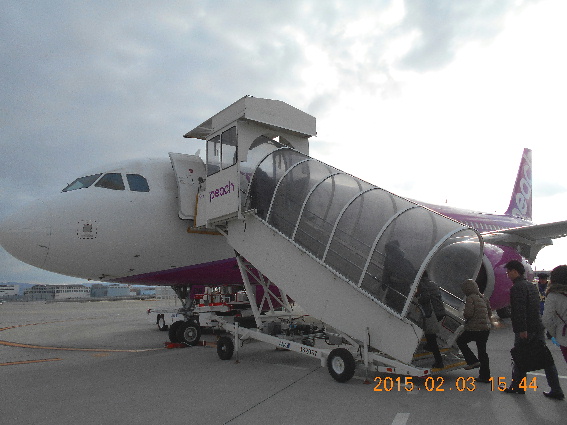 関西空港では98番ゲートから外に出て徒歩で飛行機まで行きタラップの階段を上ります。