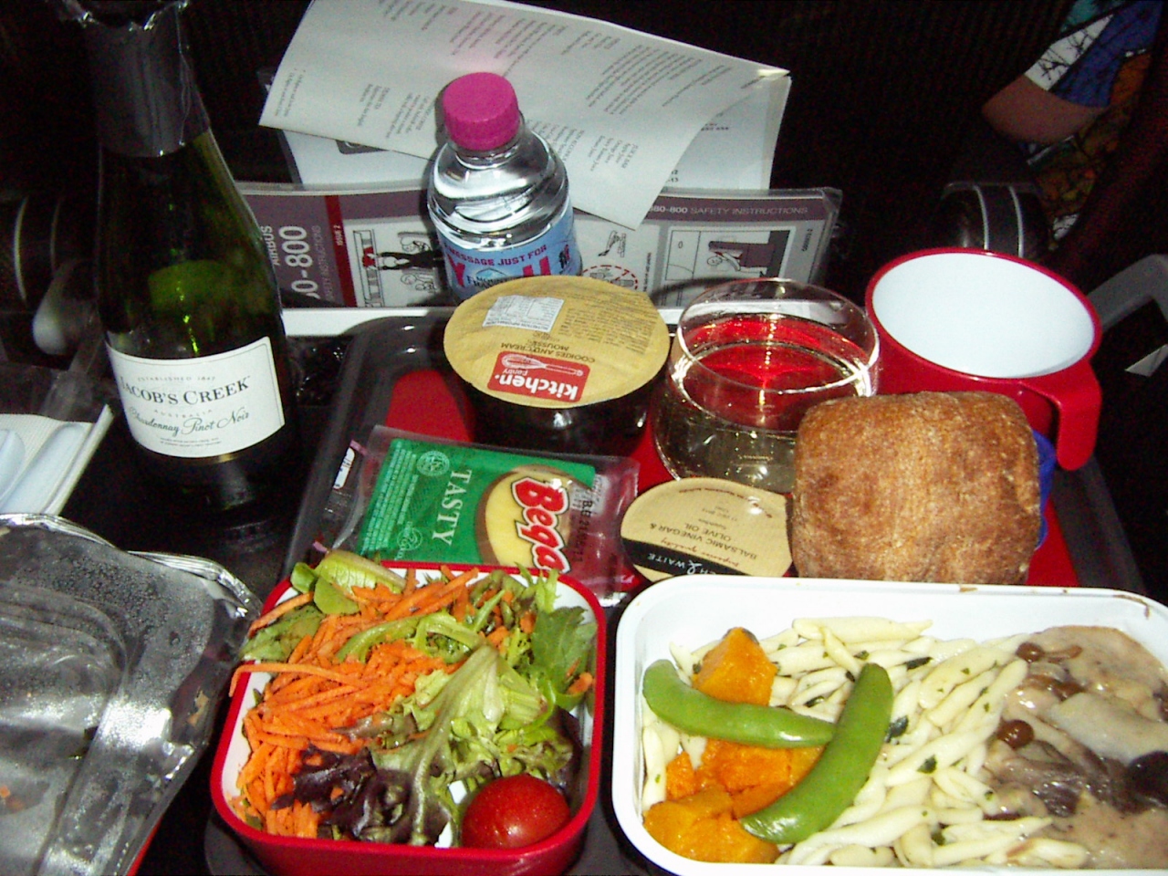 メルボルンからシンガポールまで利用しました。17時にメルボルンを出発しましたので、離陸後最初の食事はちょうど夕飯の時間帯でした。2種類の中から選択できました。飲み物にはオーストラリアのワインがあり、中にはスパークリングワインもありました。