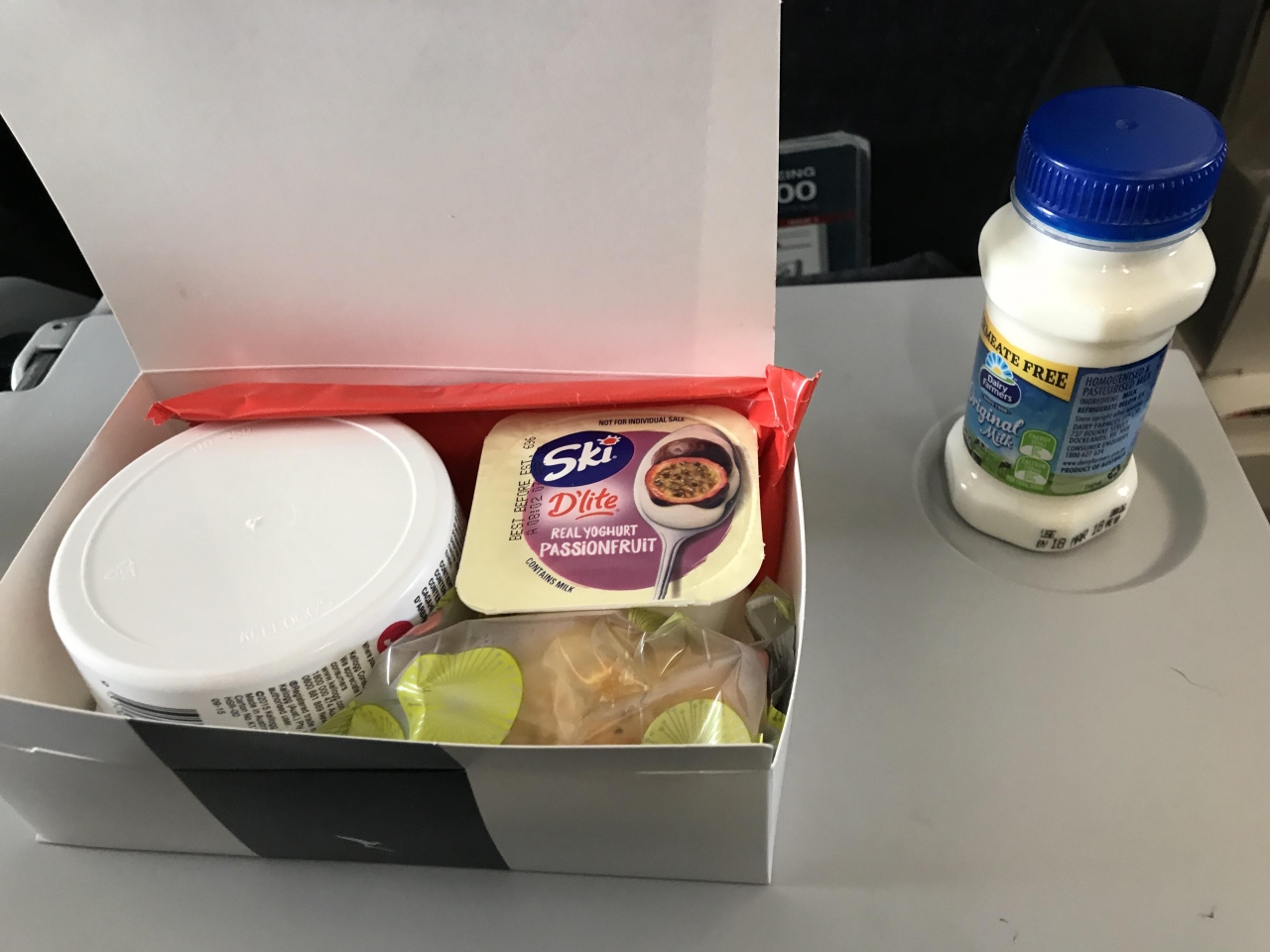 ホットなパイ?オープンサンド?か、シリアルとマフィンもどき、パッションフルーツヨーグルト、シリアル用の牛乳が