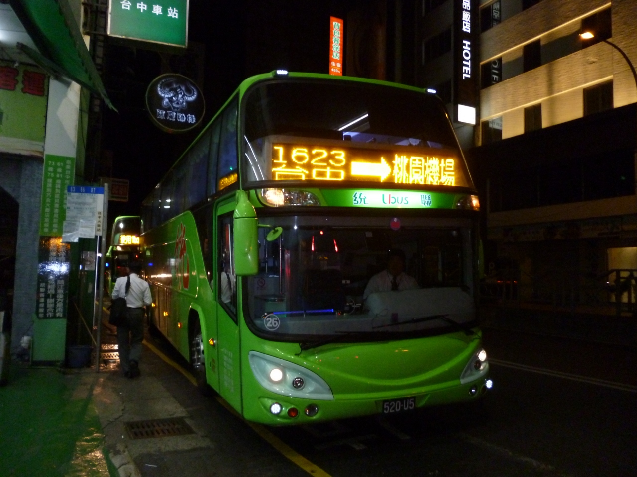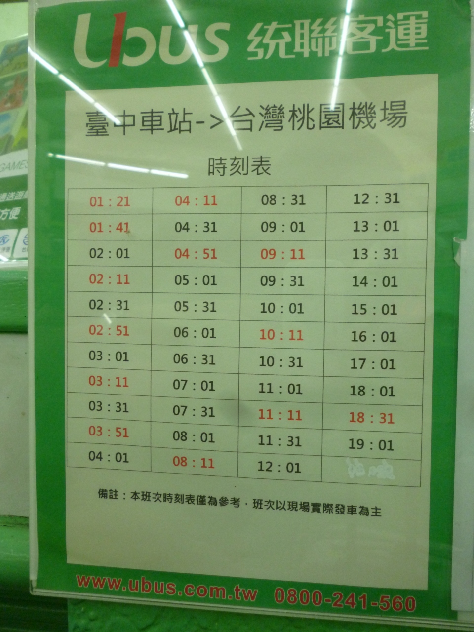 そこで今回は、20:00過ぎまで飲み食いし、21:00にホテルに荷物を取りに行き、台北バスタ-ミナル22:00発台中駅行(統聯客運240元3列シ-ト)で24:20台中駅着。台中駅の前にある統聯客運バスタ-ミナルから徒歩1分のマックで、休憩・夜食。2:01発桃園空港行(統聯客運230元3列シ-ト)で第1タ-ミナル4:15到着。4:20チェックイン(早かったのでチェックインはスム-ズでしたが5:00前後は大変混雑していました)。バスは2時間ごとの睡眠ですがゆっくりでき、寝坊も心配ありません。