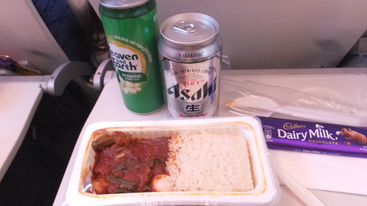 復路はエコノミー。 受託手荷物20kg、機内食(飲物付)をオプションで付けて二人分35,000円ほど。
