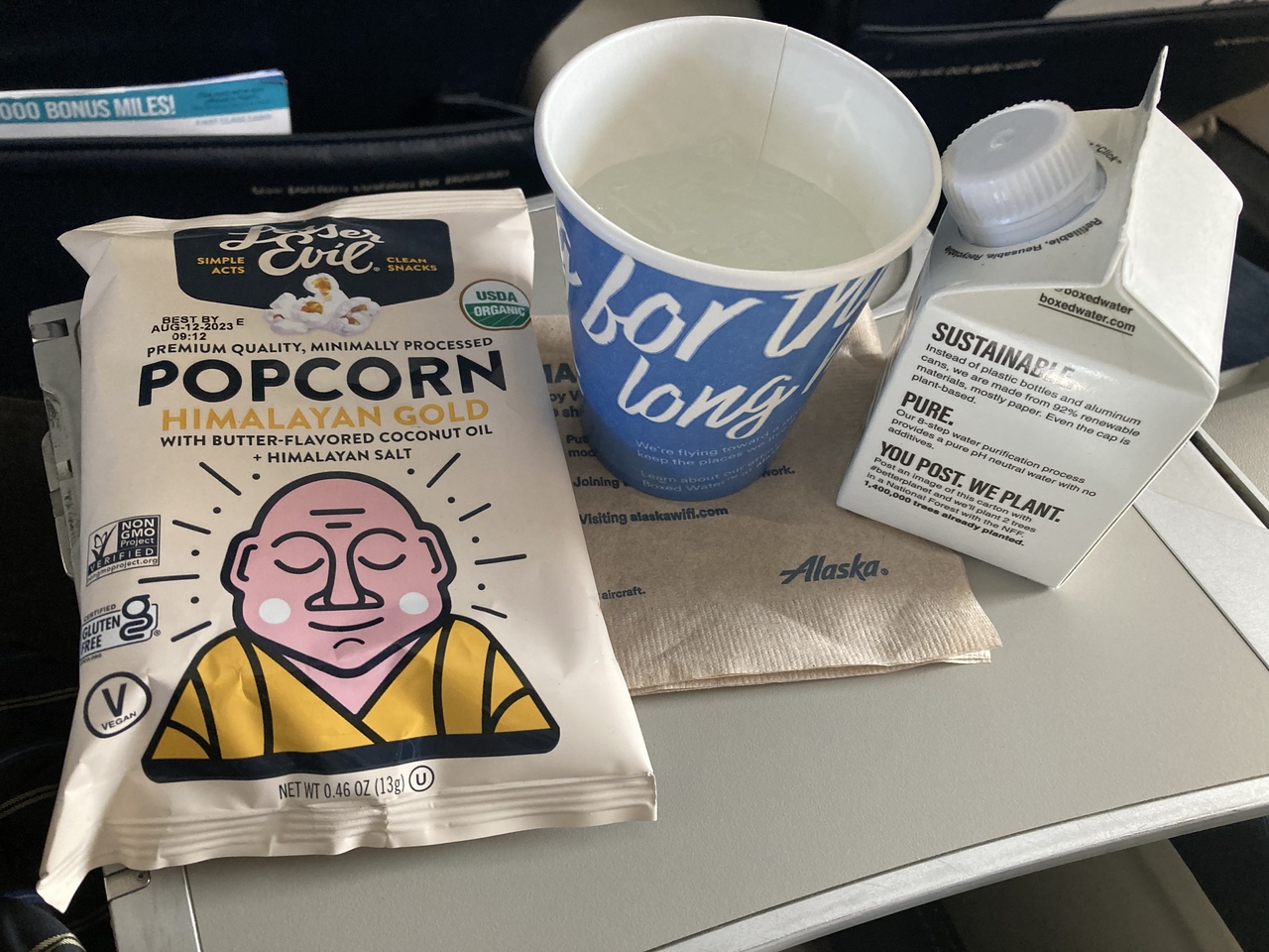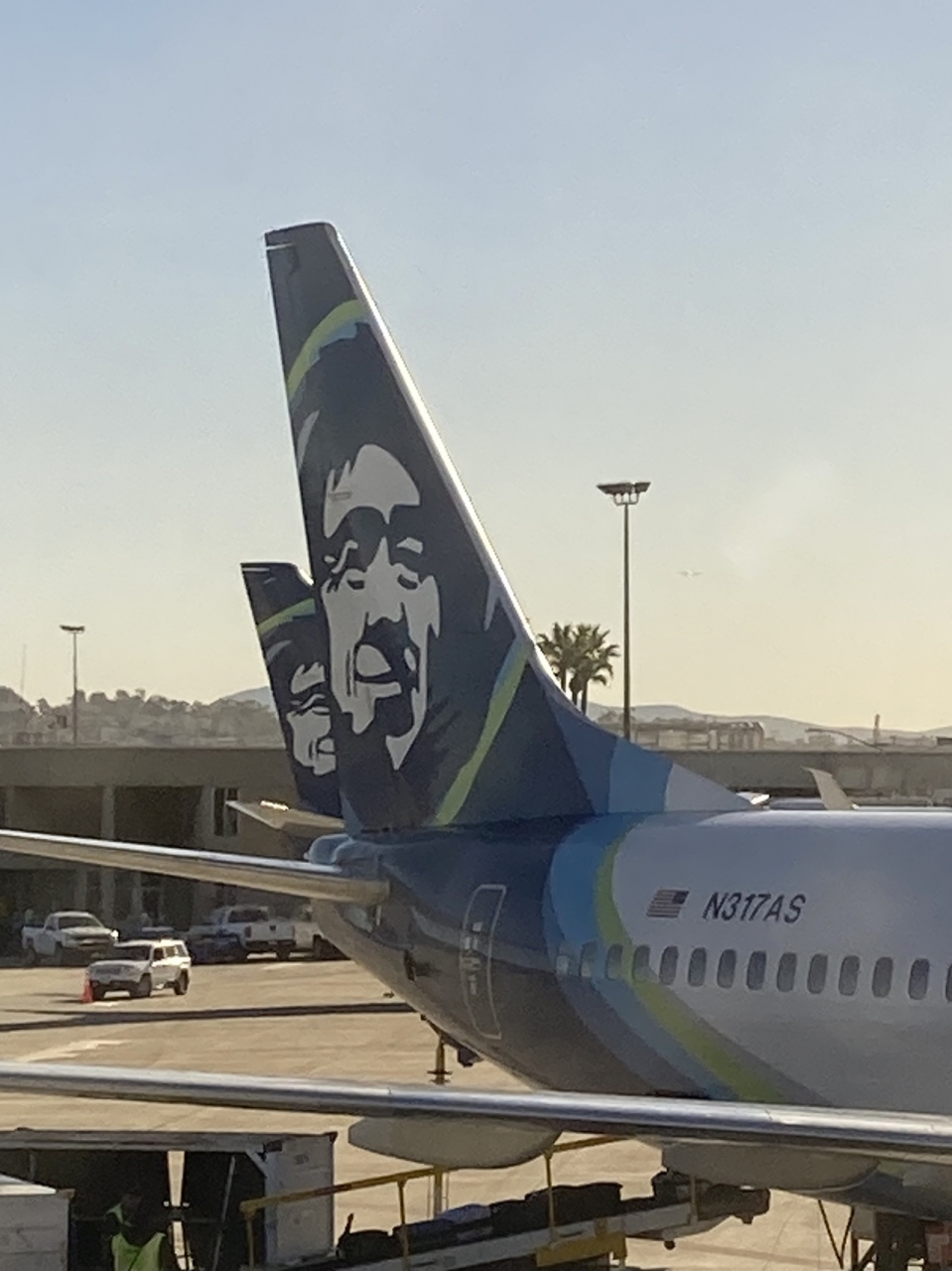 今回私が搭乗したのは、アラスカ航空とJALのコードシェア便のサンフランシスコ←→サンディエゴのフライト。チケットにはOperatiom by Skywest とありますが、空港内の案内は全てアラスカ航空で表示されているので非常にわかりにくい。機体はアラスカ航空お馴染みのエスキモーの入ったもので、サービスもアラスカ航空のものを準拠。ブラジル・エンブラエル175(E175)という小型ジェット機ながらもファーストクラスとエコノミークラスの2クラス制。往路はアップグレードされてファーストクラスに搭乗。ファーストクラスは三列シートで座席はゆったりしており、コンセント付。機内サービスは、簡単なスナックとドリンクのサービスがありました。復路はエコノミークラスでしたが、コーヒーや水のサービスがありました。