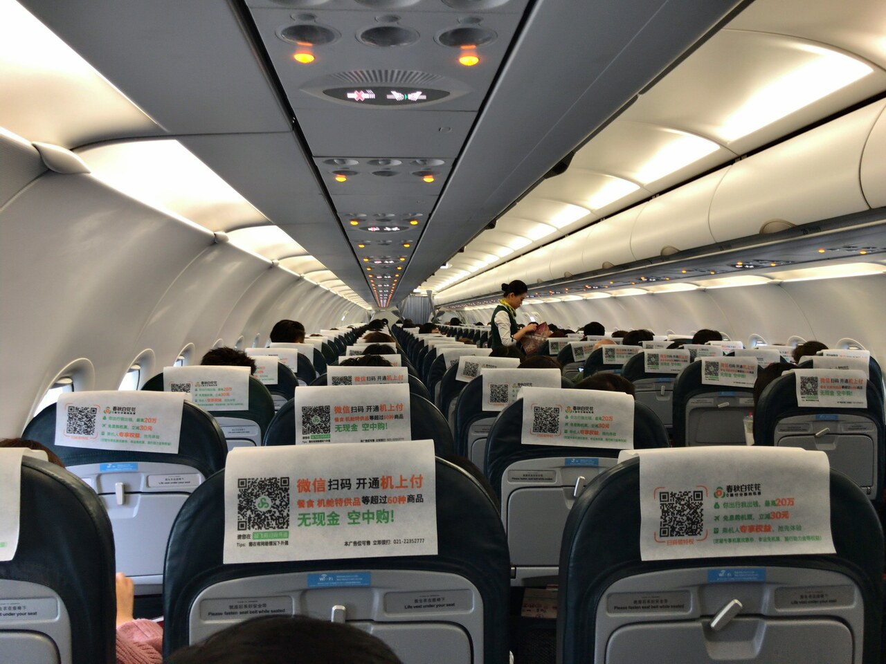 今回のシートは30列目、あえて最後尾を事前に指定しておきました。春秋航空のシステムが前から席を埋めていくため最後尾は周り誰も来ない事が多いとネットで見ていたからです。実際乗り込むと、男性CAが途中の通路にいたのですが、私が後ろに行こうとすると、え??ここより後ろ行くの??みたいな顔をされたのでチケット見せたら、あぁ~そっか、みたいな顔で案内してくれました。周りに誰も来ないからね、自由に移動してもいいよみたいな事を簡単な英語で教えてくれました。噂は本当のようです。