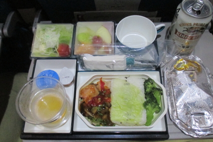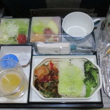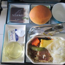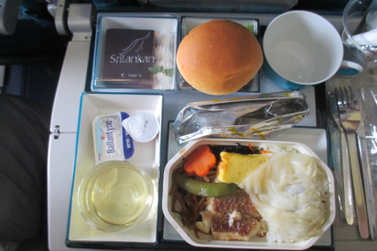 成田からコロンボへの直行便の利用です。機内食についてですが、行き(2食)は日本風の味付けですから特に問題はありませんでした。逆にスリランカ人は大丈夫なのかなと思ったくらいです。帰り(1食と朝の軽食)はスリランカの味付けですが、スリランカはインドほど香辛料がきつくないので普通に食べられました。料理そのものが日本人の口に合わないものを別にして・・・。