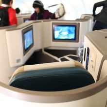 機材はやはり古く、シートは革張りですが年代を感じさせます。また、アメニティも行きはスリッパがなかったり、シートの水も常備はなかったり少しずつコスト削減をはかっているようでした。特に行きの夕食は注文をとりに来たのに、最後のほうの自分はベジタブル以外は全部でてしまっていると、ビジネスの料理数が足りないのはさすがに閉口でした。。