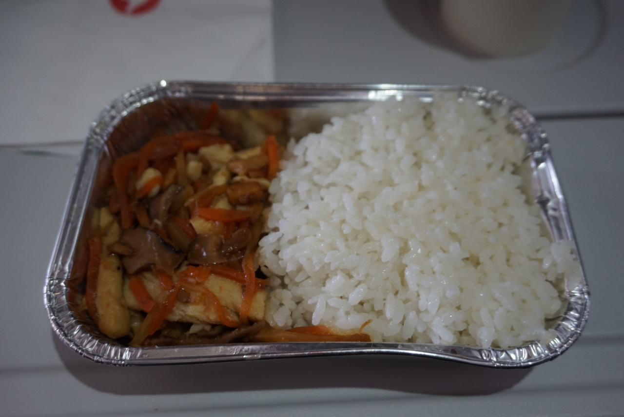 天津⇆ウルムチはモニターなしの、席も狭かったです。4時間のフライトにしては少しきつい。機内食は行きが関空発のものと同じで、帰りはラム肉。ラム肉が普通に美味しかったです。