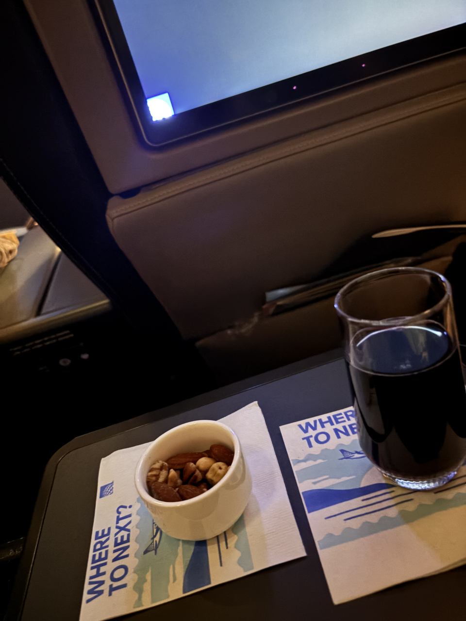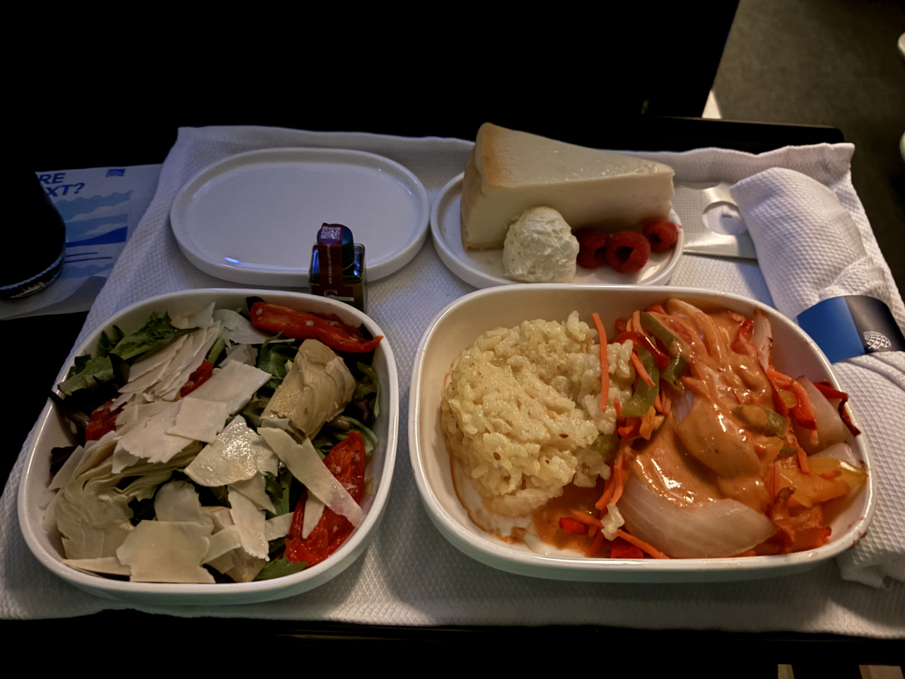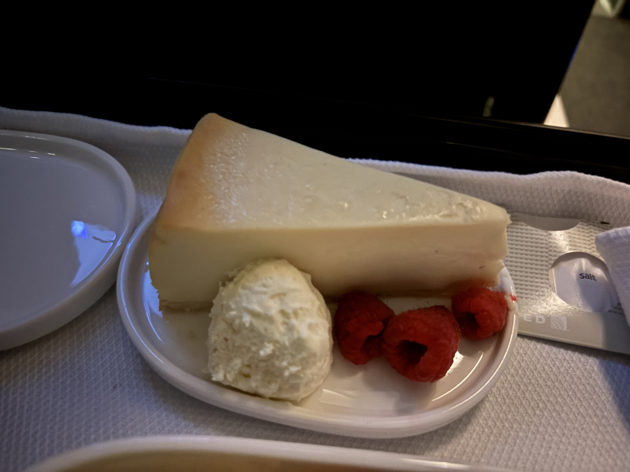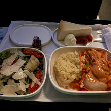 出発時間が遅い時間だったので、残念ながら空港のラウンジを利用することができませんでした。機体ですけれど、ビジネスクラスは2席、通路、2席になっています。長距離路線ではないので、座席はフラットになりませんが、立派なシートなので、5時間弱のフライトでも問題ありません。機内食が提供されるのが、夜中になりますけれど、ちゃんと食事のメニューも配布されました。豪華な食事ではありませんが、メインのサーモンの味も、普通に食べることができる味付けです。サラダのボリュームが多かったのが嬉しいですね。夜中のフライトなので、十分な機内食なのではないでしょうか?アメリカの航空会社なので、あまり期待をしていなかったですけれど、快適に過ごすことができました。