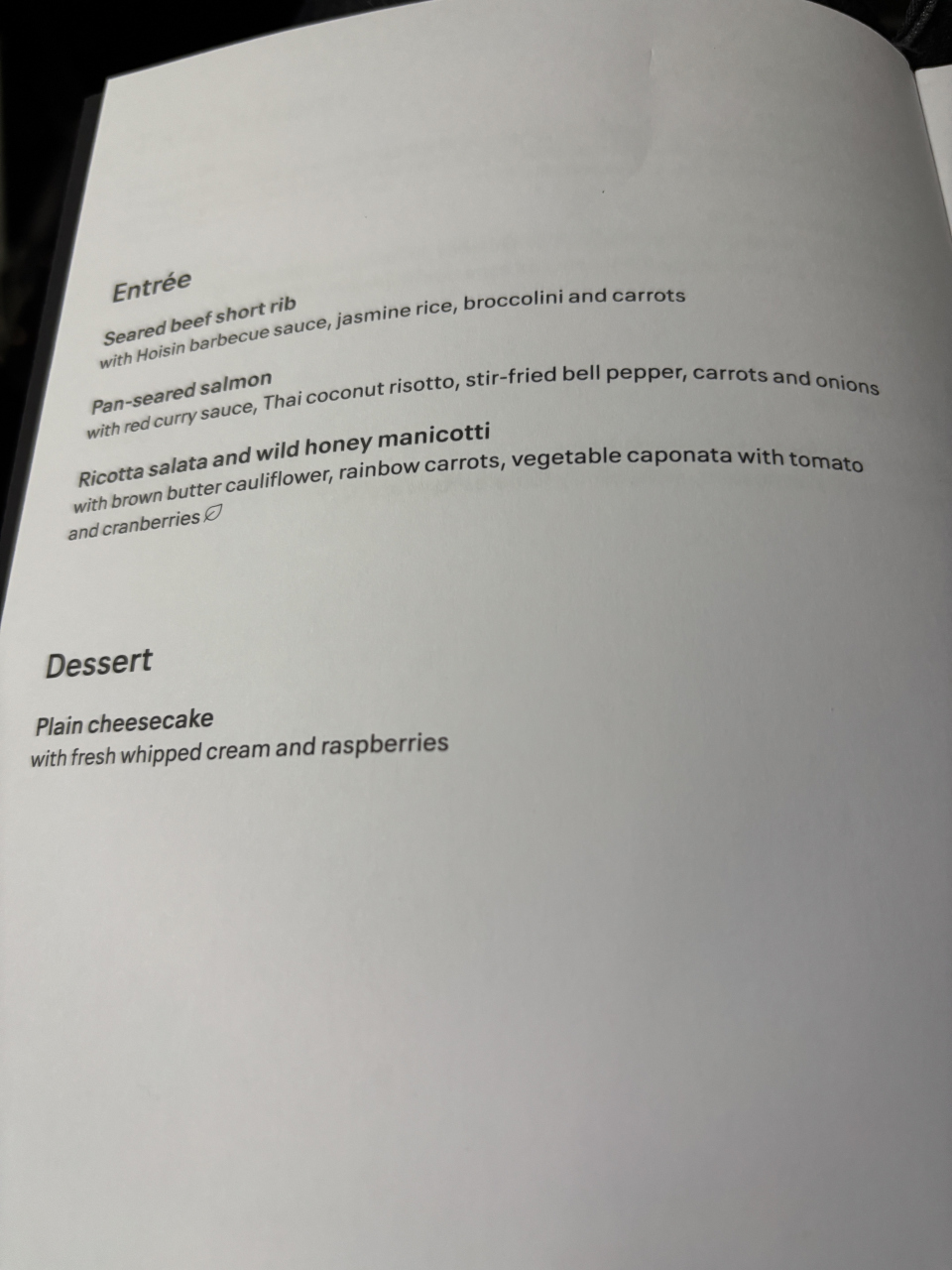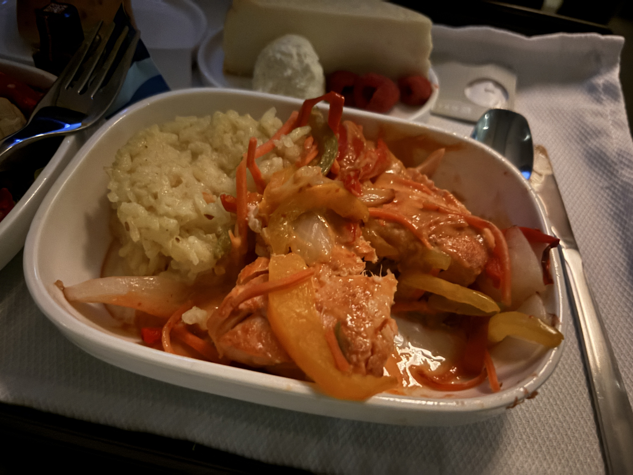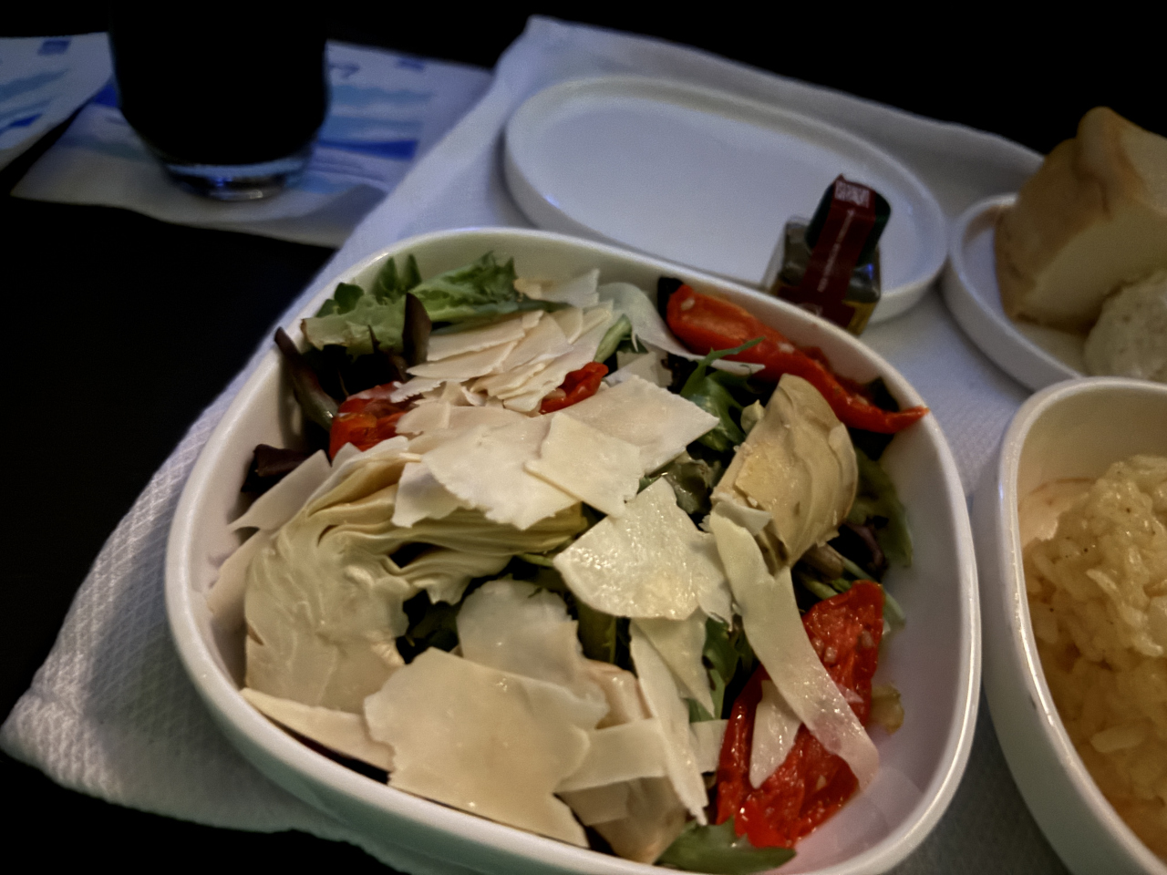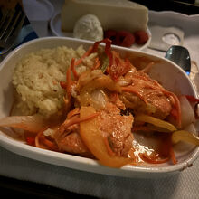 出発時間が遅い時間だったので、残念ながら空港のラウンジを利用することができませんでした。機体ですけれど、ビジネスクラスは2席、通路、2席になっています。長距離路線ではないので、座席はフラットになりませんが、立派なシートなので、5時間弱のフライトでも問題ありません。機内食が提供されるのが、夜中になりますけれど、ちゃんと食事のメニューも配布されました。豪華な食事ではありませんが、メインのサーモンの味も、普通に食べることができる味付けです。サラダのボリュームが多かったのが嬉しいですね。夜中のフライトなので、十分な機内食なのではないでしょうか?アメリカの航空会社なので、あまり期待をしていなかったですけれど、快適に過ごすことができました。