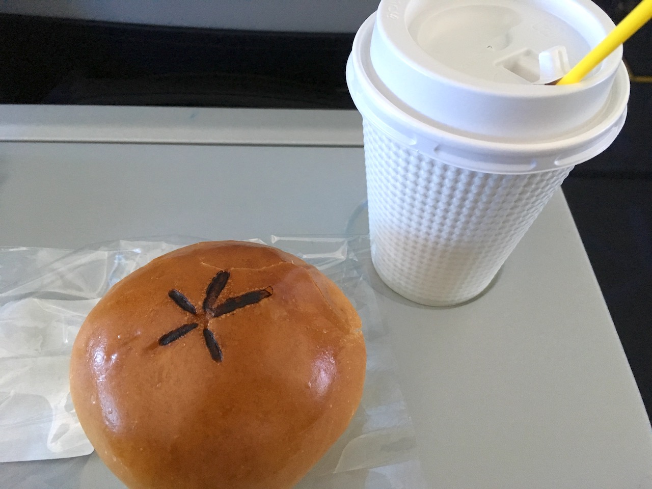 行きの飛行機では、機内で抹茶クリームパンとコーヒーを購入。