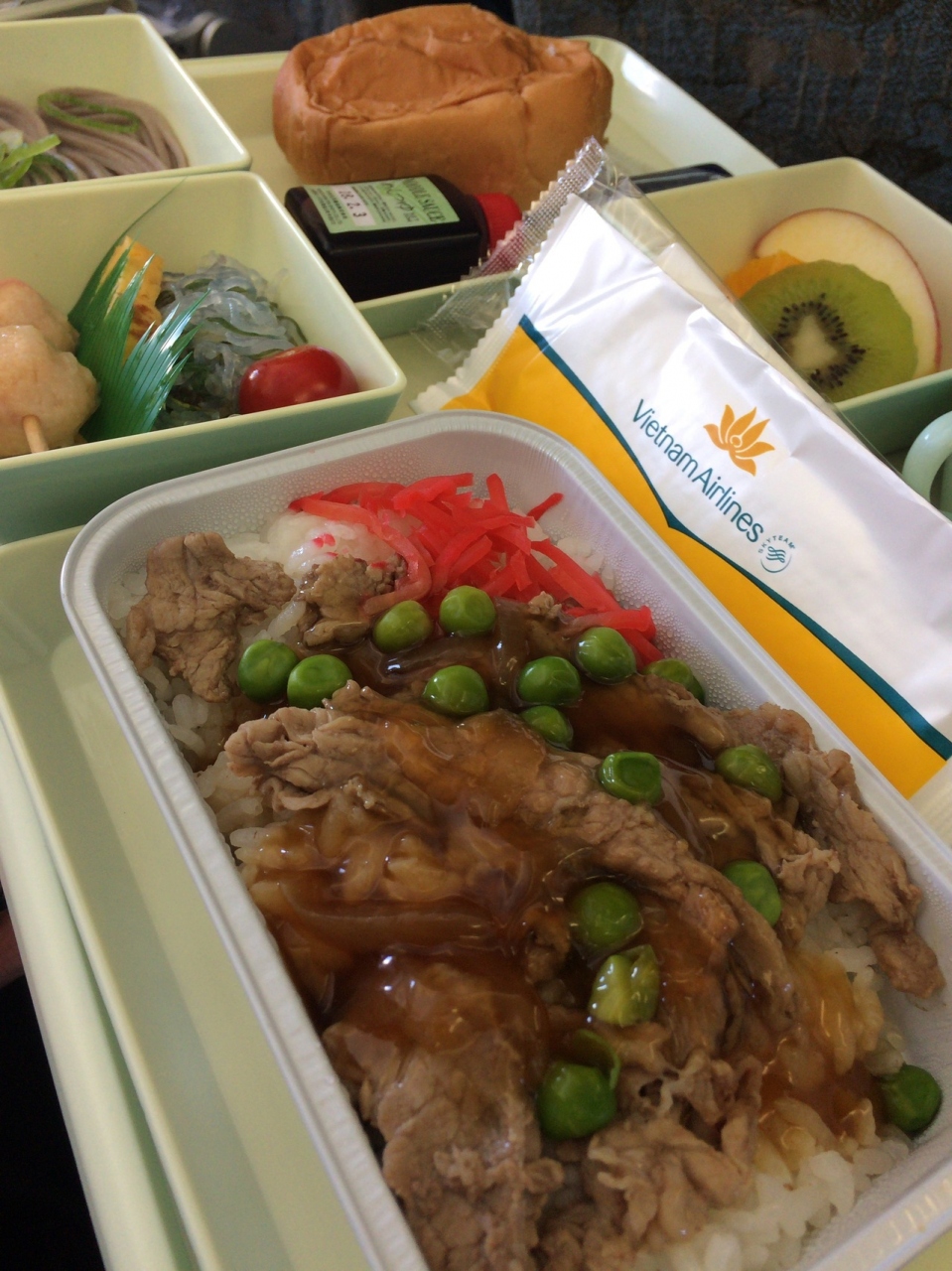 ベトナム航空は、小さめの飛行機で、座席が国内線みたいに3-3しかありませんでした。4人の家族だと3-1になって、ちょっと不便かも!!