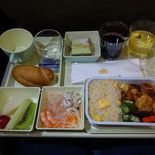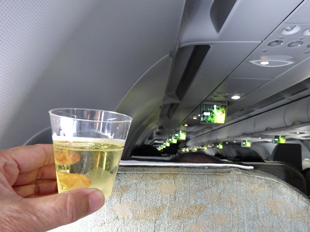 個人的に好感が持てるのは,エコノミーながら飲み物としてスパークリングワインが出ることです。ただし,食事の際にはワゴンの上に乗せられて延々と運ばれてきますので,かなりぬるくなっているのが残念です。