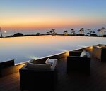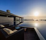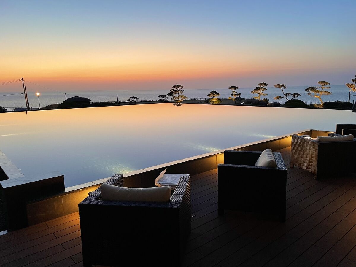 部屋の大きな窓からはもちろん、ホテルのどこにいても海が眺められます。 夕食のダイニングからは海に沈む美しい夕日が見られました。 ロビーでのウエルカムドリンクや水盤前の足湯、北沢浮遊選鉱場跡ライトアッ