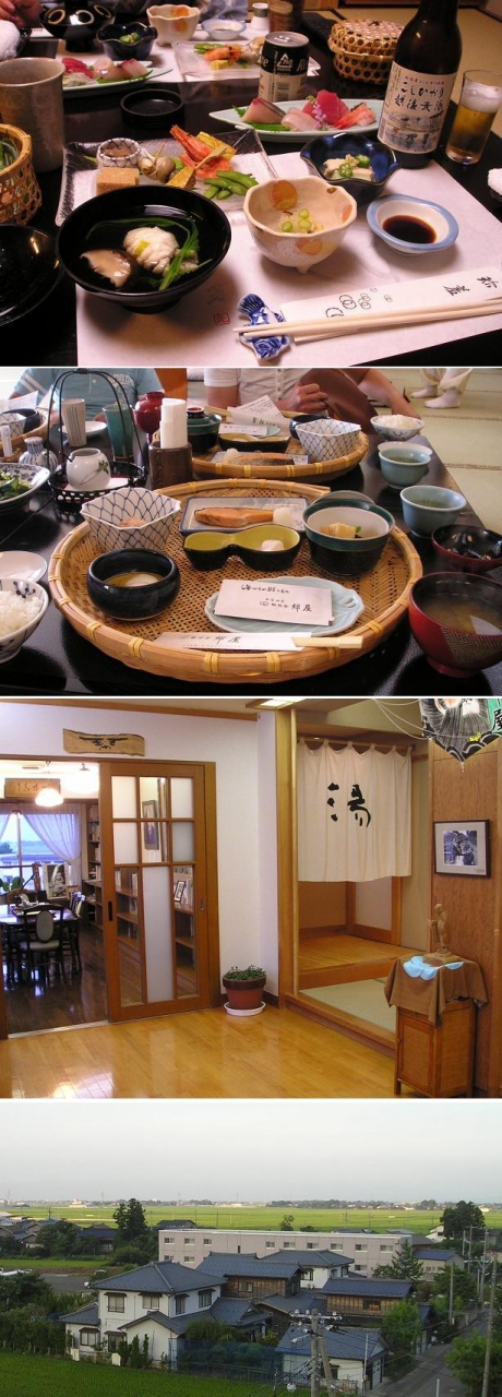 ▼写真は上から夕食、朝食。風呂場の横には図書室があります。東側の風景、越後平野です。