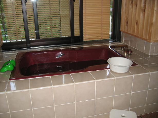 ネットの写真では、バスタブのあずき色の外側が床のタイルだと思ったら、ただの幅広の風呂枠で、手前に普通の洗い場があります。窓は網戸のない普通のサッシで、写真のようにすると対岸のホテルから、丸見えです。