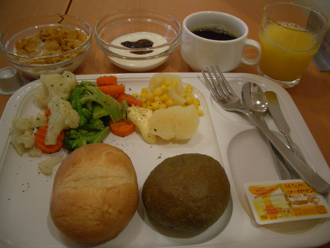 サラダが温野菜だけどブロッコリーやカリフラワー、にんじんなどで見た目も良い。ポテトやコーンなどもあった。意外とパンがおいしかった。シリアルやヨーグルトもあり、無料ではいい感じであると思う。食器も同じもので使えるのでかえってかえって使いやすいかも。