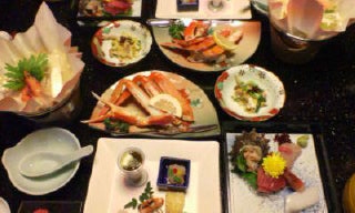 11月は松葉ガニの解禁とあり、カニづくしバンザイな夕食でした。ゆでガニ・焼きガニ。大きなものが1人に1ハイはありました。その他らっきょうの天ぷらなど地方色がでてましたね。