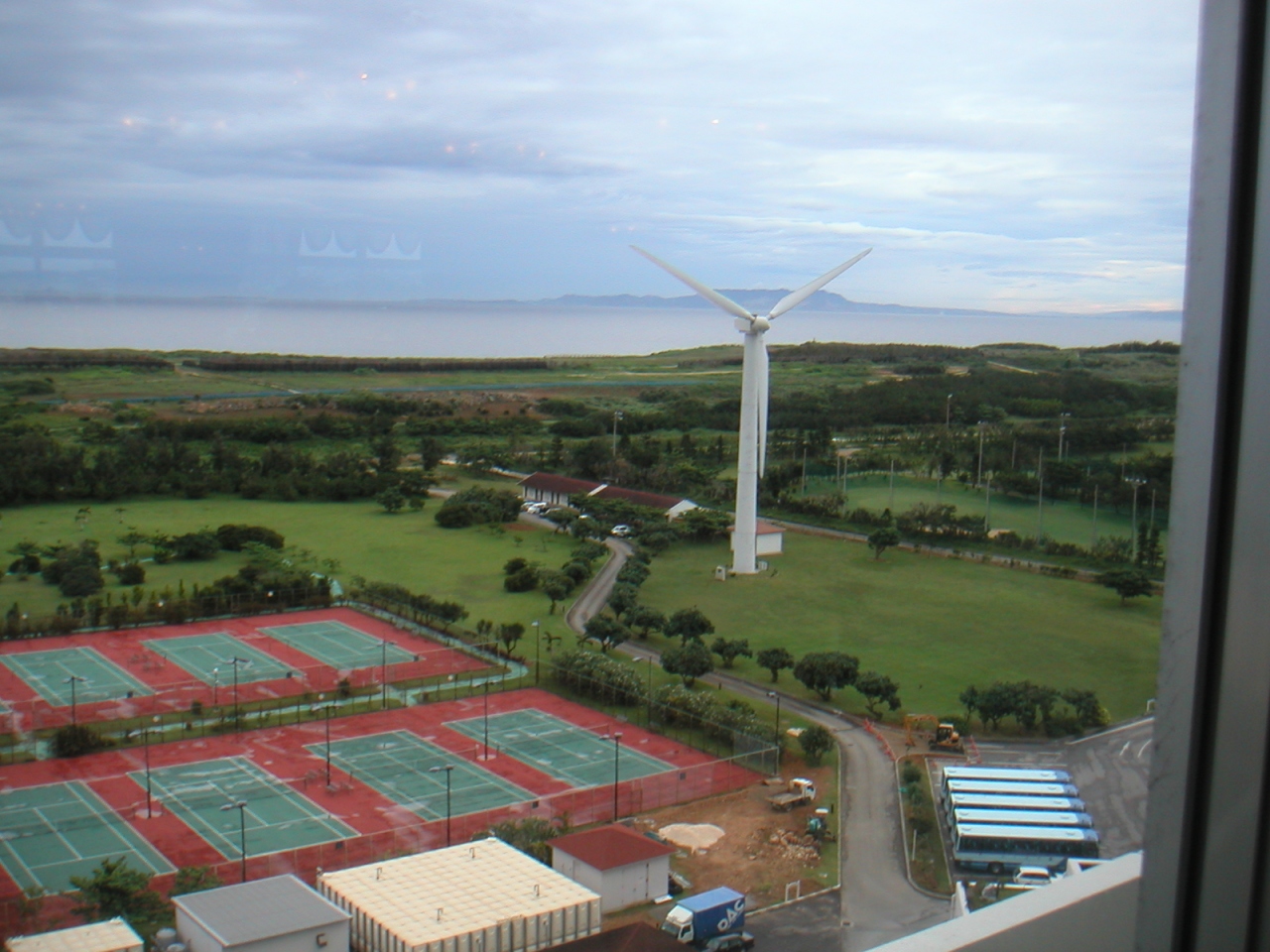 画像は、お部屋からみた景色で、風力発電の風車です。