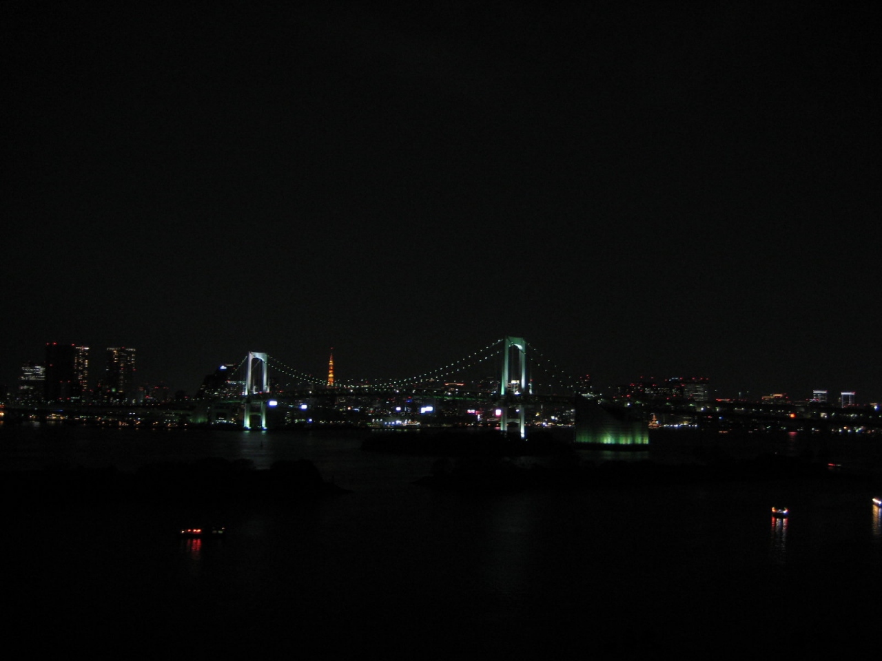 レインボーブリッジの後ろに東京タワーが見えます。