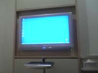 日立の32型液晶テレビの下にPCがセットされている模様。壁に埋め込まれたPCの電源スイッチが部屋に入った時点でONになっていた、が、テレビに写らず。キーボード操作をしても反応なし。仕方なく、ブチッと電源入れなおし。