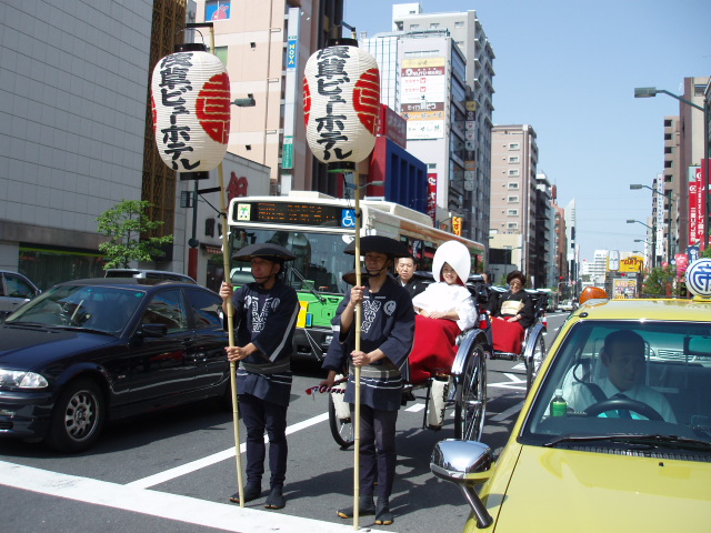 一覧を見る浅草神社への送迎は人力車、浅草雷門通りの巻