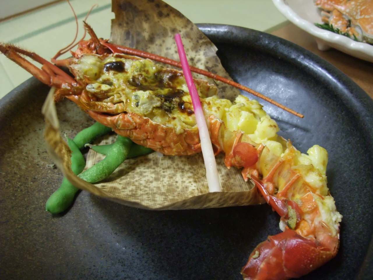 食事は、お風呂と同じ棟の広間に準備されていました。私が泊まったときは、前菜3種盛り(1品は牡蠣でした)、お刺身5点盛り、奥三河地鶏のしゃぶしゃぶ、メダイの煮付け、ワタリガニ、伊勢えびのクリーム焼き、天ぷら、茶碗蒸し、小鉢が2皿、ご飯とお吸い物、そして年越しそば、デザートと、食べきれないほどでした。味もおいしく、大満足でした。