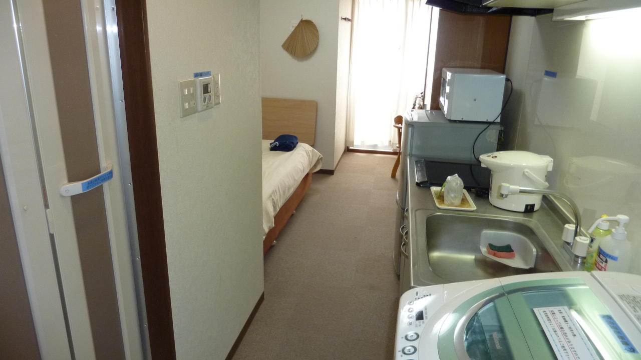 現在の正式ホテル名は、「ホテルピースランド久米」です。石垣島の同系列の宿泊施設に4泊後、那覇でこのホテルに2泊しました。楽天トラベルで、シングルルーム1泊4,400円で予約しました。このホテルを選んだ理由は、ゆいレールの県庁前駅から徒歩5,6分と近い事、部屋内に乾燥機能付き洗濯機があるからです。ホテルは、ちょっと古めのワンルームマンションをホテル形式で使っている感じです。部屋は、約17?の広さがありますが、縦長の部屋なのでちょっと窮屈感があります。部屋内には、キッチン、ポット、大型冷蔵庫、電子レンジ、乾燥機能付き洗濯機、ビデオデッキなどがありました。ホテルの近くには、コンビニも数軒あり、ファミレス(ジョイフル)、弁当店(ほっともっと)もありました。少し距離はありますが、「波の上ビーチ」に歩いても行けます。国際通りの県庁側入口迄は、徒歩7,8分程です。滞在中、そんなに多くはない量の洗濯をしたのですが、ドラム形式の洗濯乾燥機ではないので、乾燥にとても時間が掛かり、完全に乾燥するまで6時間以上掛かりました。勿論無料で使えますが、これなら他のもっと便利なホテルに泊って、そこのコイン洗濯機や乾燥機を使っても良かったと思えた、ちょっと微妙なホテルでした。でも、那覇滞在中に、波の上ビーチに泳ぎに行きたい人には便利かも知れません。