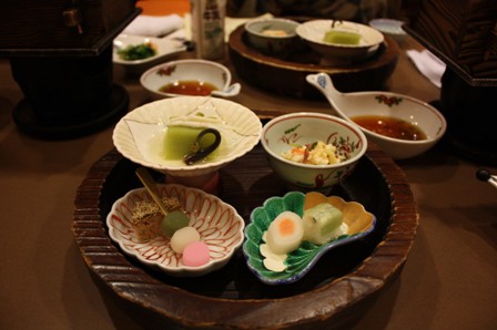 お品書きは杉桶盛り(写真)、刺身、竹の子まんじゅう、牛せいろむし、鶏の焼き物パイ添え、ところてん、炊き込みご飯、お椀、香の物、デザートでした。せいろむしの牛はやわらかく食べやすかったです。ところてんは自分でその場で押し出して食べるものでした。大型高級旅館の、ごくオーソドックスな料理といった印象です。お椀は、魚節のだしがしっかりと感じられました。