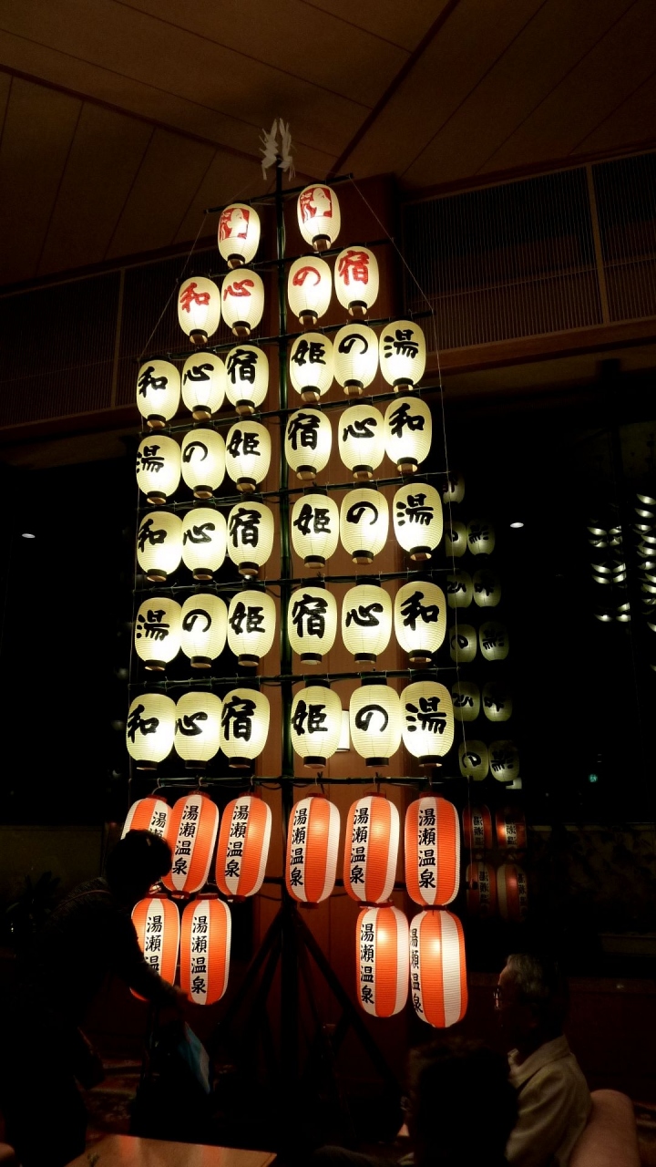 湯瀬・・ゆのせ、ゆせでなく「ゆぜ」と読む。ロビーから大浴室まで33間あり、近づくにつれあと何間という案内がある。湯上りに地元の名水を飲めるような気配りがある。