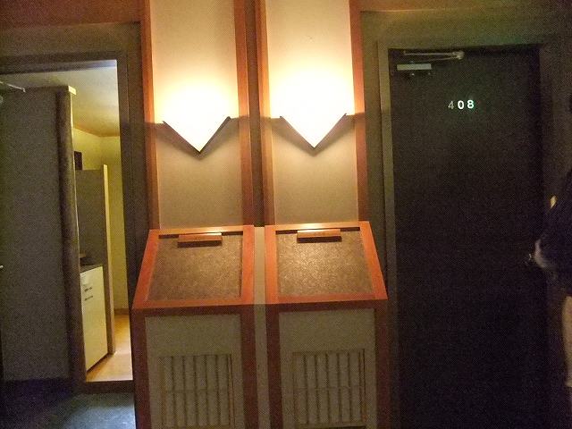 オークウッドレジデンス24ホテルの2階。エレベータに向かう途中のここ。奥の2室だけ特別らしい。前に扉が両側にもうけてあります。ドアの横がクローゼット。目の高さに... もっと見る