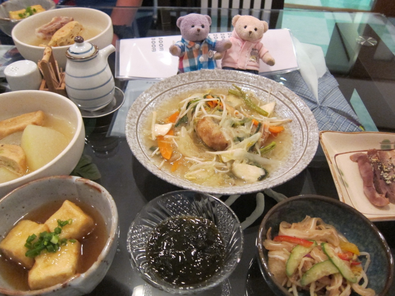食事は日替わりでかなり種類と量がありますが、ごってりした料理がないので全部食べられます。薄味でおいしいです。島の食材を中心としたメニューです。