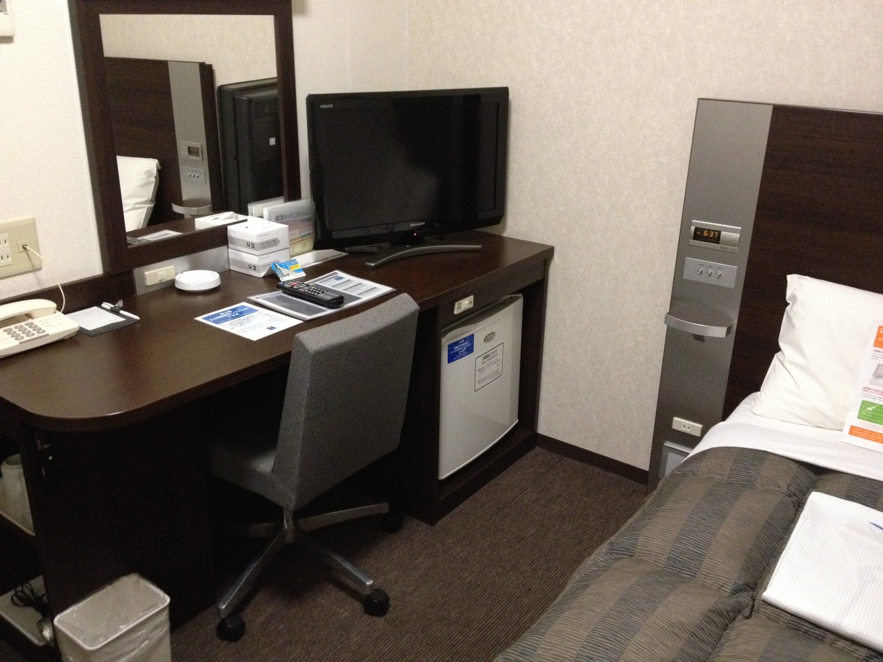 部屋はご覧のとおり狭い。ハンガーかけも壁にあるし