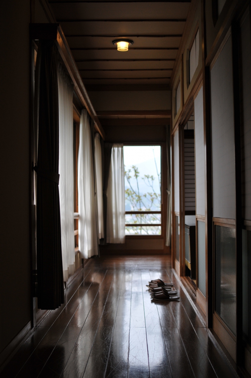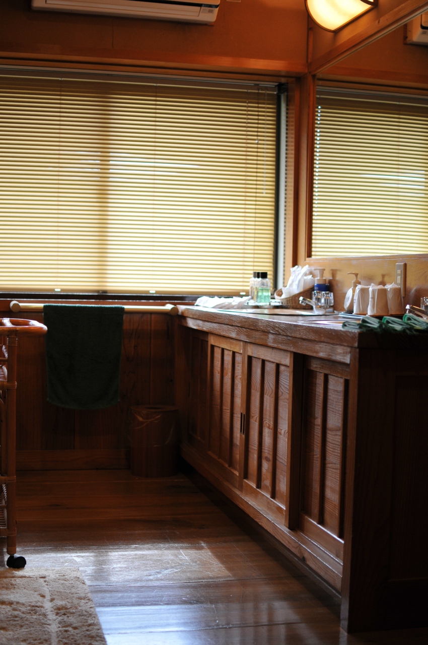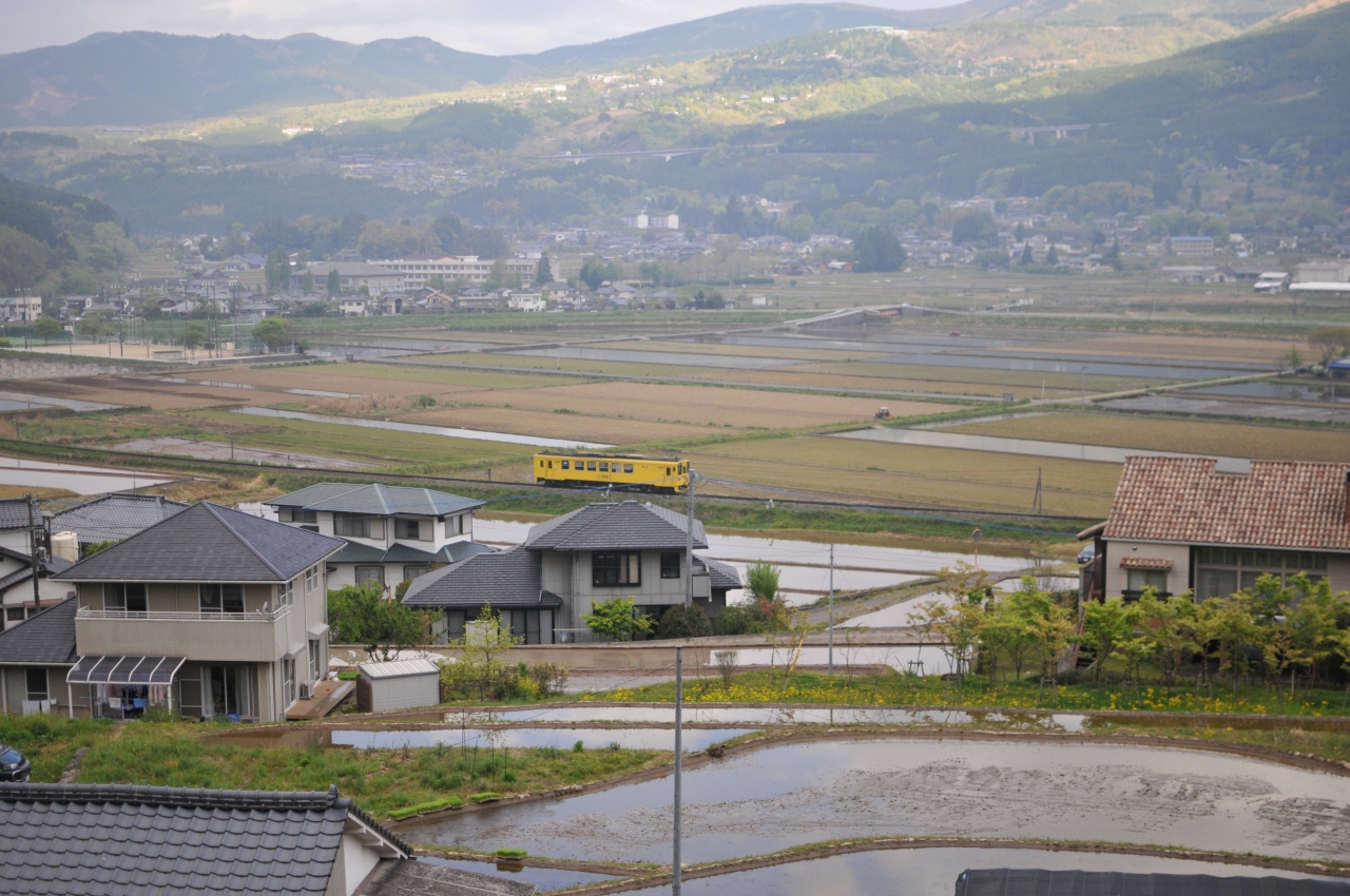 和室の広い部屋に泊めさせて頂きましたが、昔の農家のお屋敷のような広い部屋で満足でした。窓辺から由布院の盆地がすっきり見え、田んぼの中を久大本線が走っています。この田園風景もなかなか良いものです。