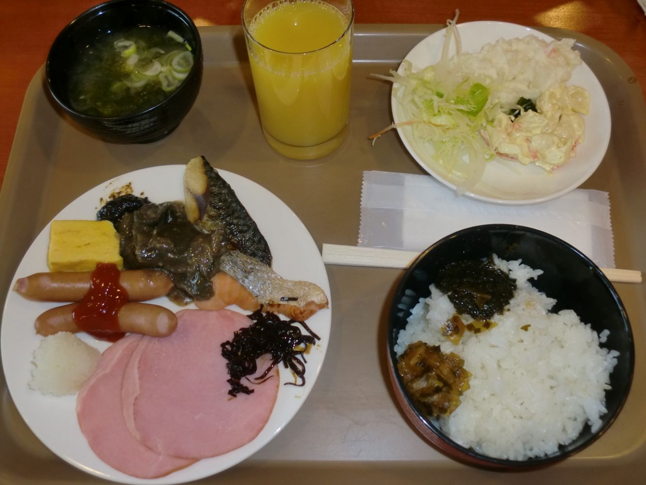 無料の朝食には、御飯、パンのほかに、ウインナー、たまご焼き、焼魚、サラダなどメニューが豊富でとっても割安感を感じたホテルでした。
