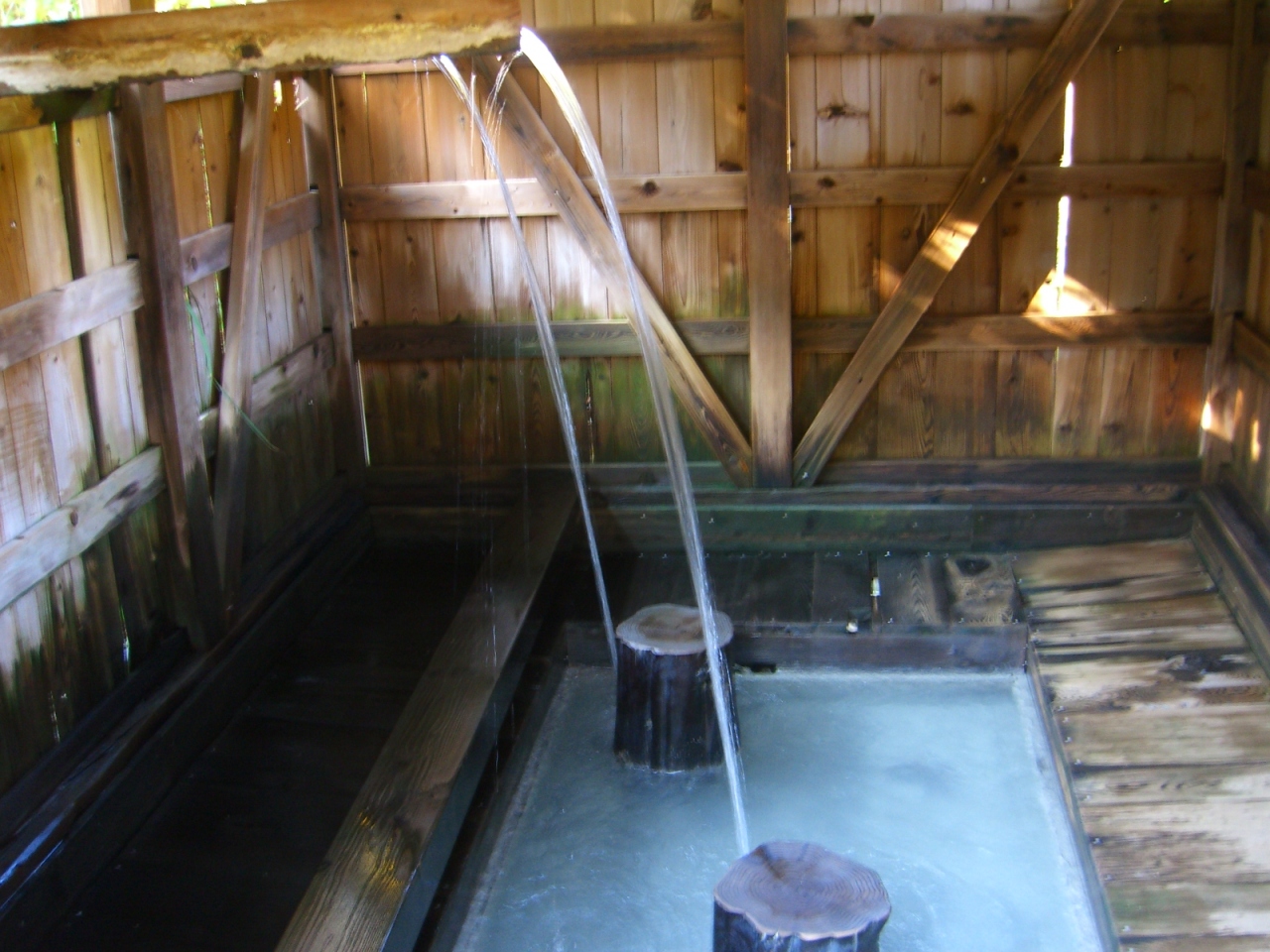 孫六温泉と黒湯温泉の共同駐車場を下ると葺きの黒い宿舎や湯小屋が寄り添うように見えてきます。駐車場からフロントまで5分ぐらいです。混浴の露天風呂の景色が素晴らしく湯も乳白色で体によさそう。混浴の露天風呂と内湯とうたせ湯はつながっています。うたせ湯は湯量が少なく寒かったですが、すぐ内湯に行き温まりました。他に離れて男女別の内湯と露天風呂も雰囲気泉質とも良いですよ。別にうたせ湯専用の小屋があり、こちらの湯量は多く、肩こりが少し治りました。旅館部と自炊部があり、湯治場の情緒の象徴的な宿です。