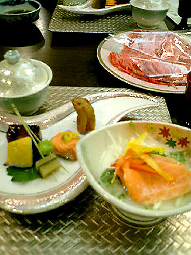写真は前菜とその奥にしゃぶしゃぶ。豪華、量も凄い。しゃぶしゃぶにたどり着くまえにお腹いっぱい。いや本格的に着付けをしてもらった浴衣の帯がきつい…。