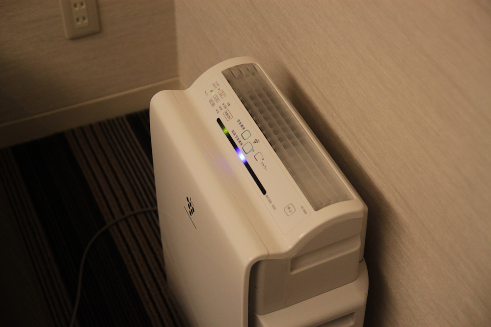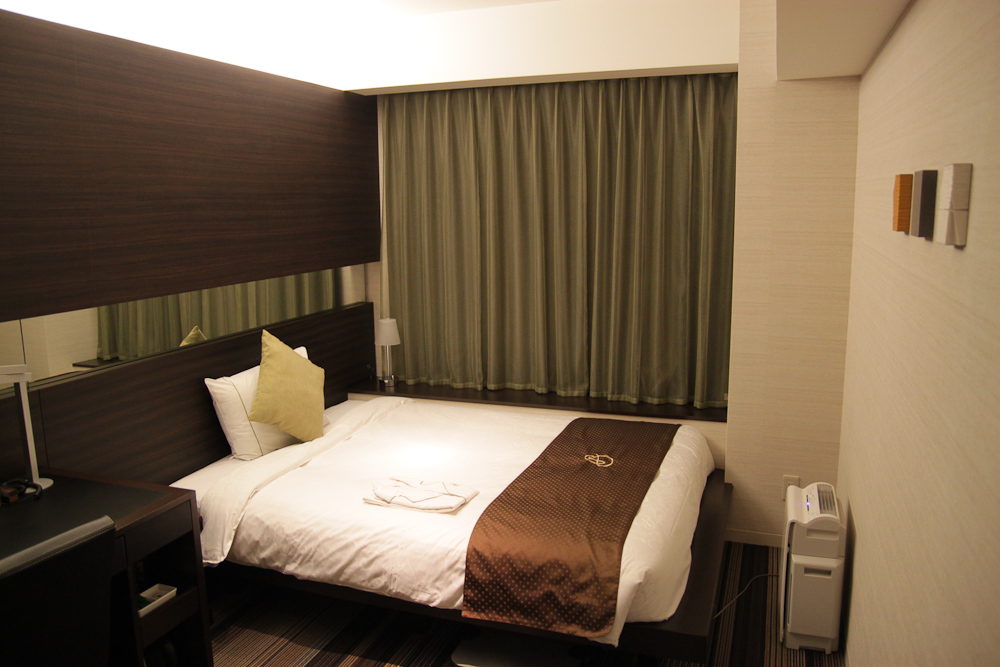 写真でわかる通り、重厚感のある室内と広いベッド。これでビジネスホテルカテゴリーの割安な料金ですから、宿泊に特化して考えた場合のコストパフォーマンスは抜群ではないかと思います。加湿の出来る空気清浄機備え付けなのもポイント高いですね。