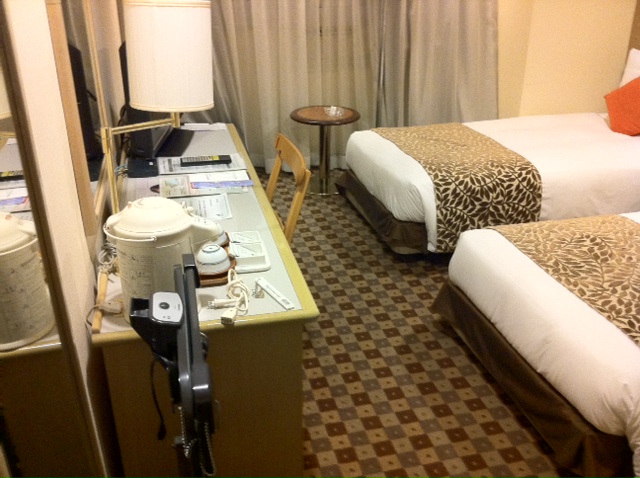 部屋はそれなりに広いのですが、シングルベッドが離れて2つ。ライティングデスクは狭く、その上にポットがおかれており、実用的スペースはほとんど無し、コンセントもデスク側には空きがほとんど無し。