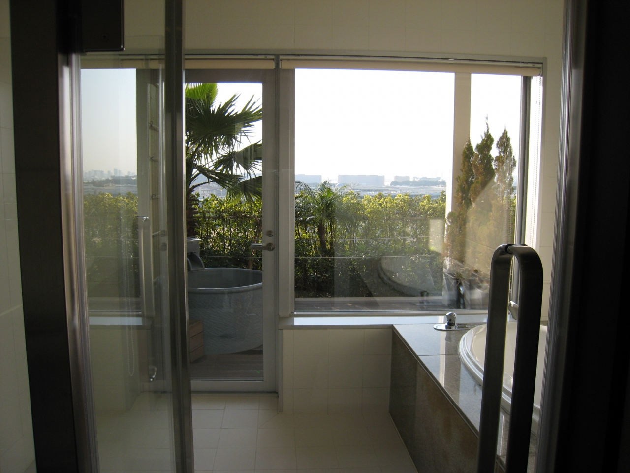お部屋については、ホテルの都合で予約したものよりグレードアップされたところに案内されたのですが、ここがすごく良かった。TDRに面したスイートのような部屋なんですが、ちょっとした高級マンションみたいな作りで、バルコニーに露天風呂、ガラス張りのバスルームにもお風呂、そしてツインのベッドルームにテレビのあるリビング、さらに和室という贅沢さ。宿泊日がバレンタインだったためTDRの花火を見ながら露天に入れました。
