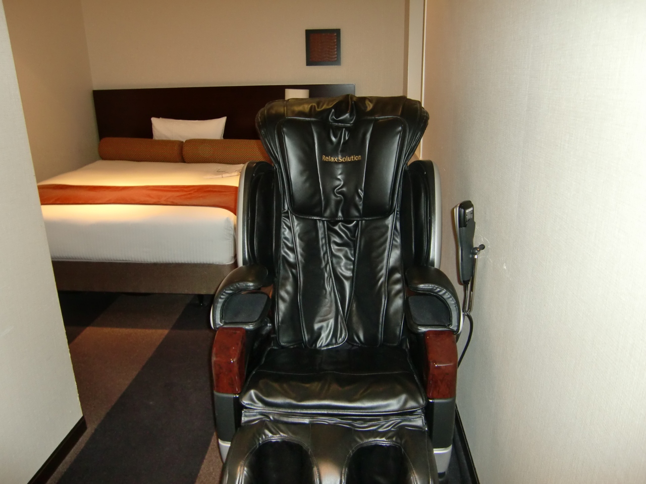 サピアサワーの27階です。チェックインは15時からでしたが、13時半くらいにホテルに着きチェックインできるか聞いてみましたら「少しお待ちいただければ大丈夫です(^^)」とおっしゃっていただき早めのチェックインをさせていただきました。部屋に入ったら、マッサージチェアが置いてあったのでびっくり!!これにすわってテレビを見てたらホテルから出たくなくなりました。そのほか空気清浄機なども置いてありました。