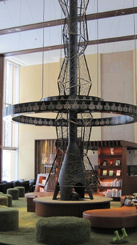 玄関入ってすぐ暖炉つきの大きなオブジェがあり、靴を脱いでくつろげるラウンジになっています。森林をガラス越しに眺めながらのハープの演奏がとても素敵でした。