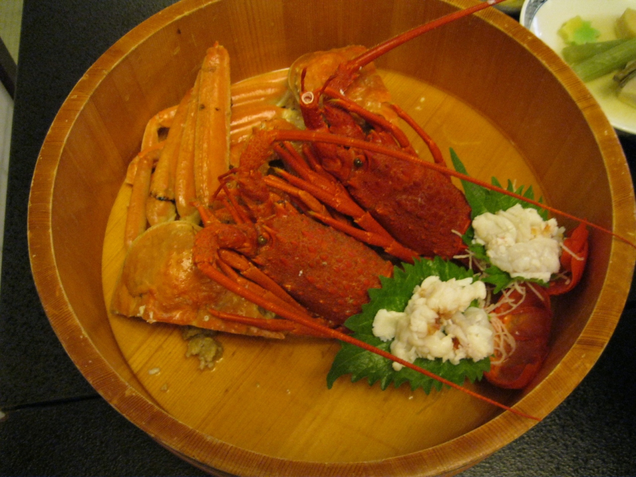 夕食は、先付け、お造り、煮物、鍋物、焼物、伊勢海老とカニ、アワビのバター焼き、