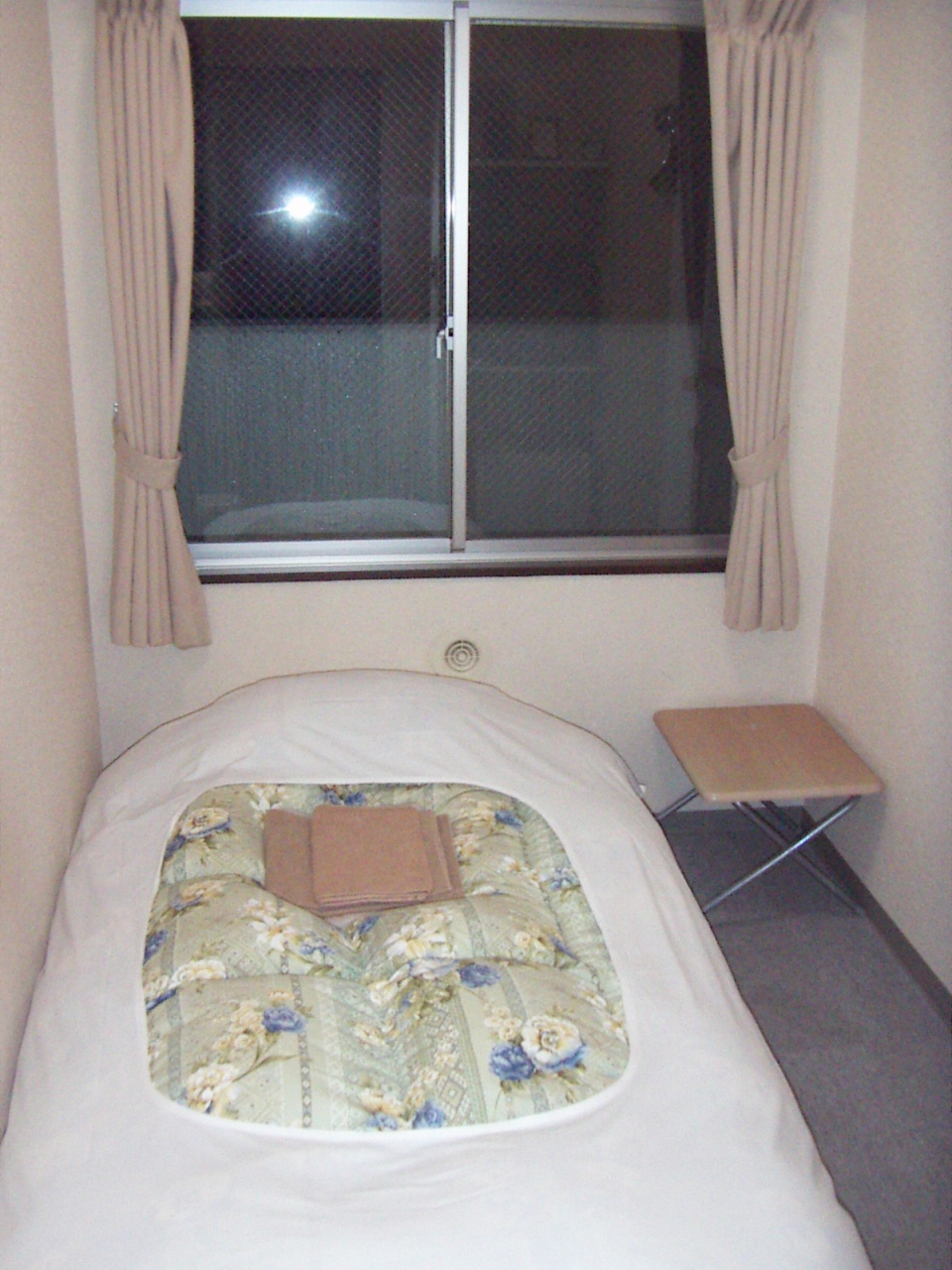 客室は約3畳ほどの洋室。ベッドに小さなテーブル、テレビ、冷蔵庫、有線LANとシンプルな設備です。バス、トイレは共同です。きれいな館内で気持ちよく過ごすことができました。