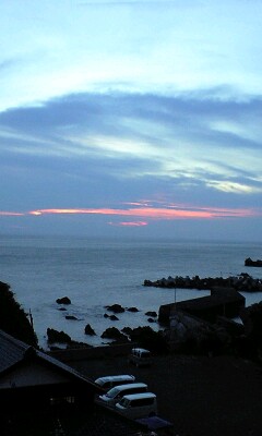 お部屋からもお風呂からも海が見え、きれいな夕焼けと、夜は漁り火を堪能しました。