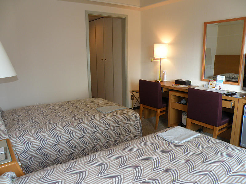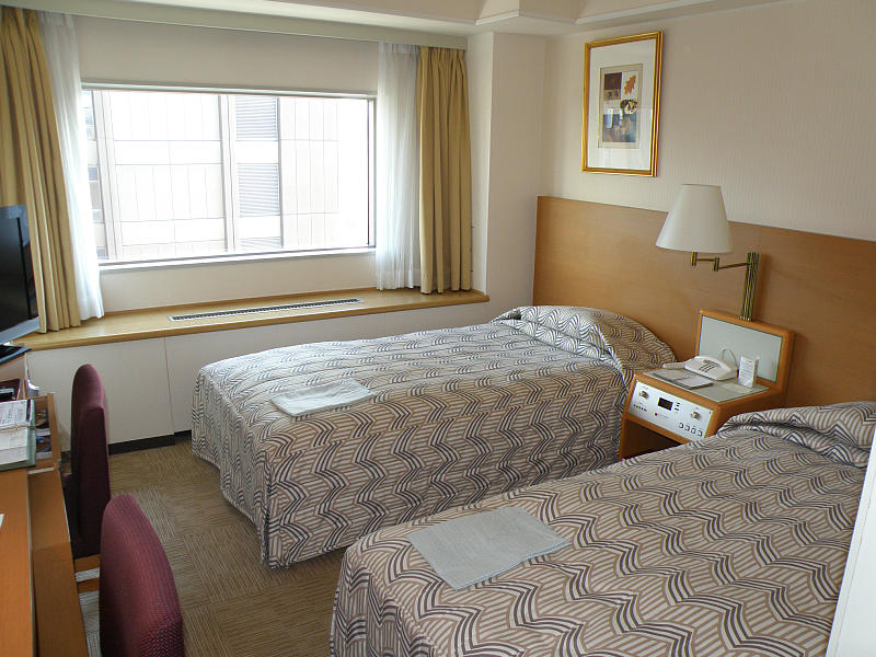 案内されたのは別館2114号室でタイプはスタンダードツイン。北1条通に面した10階で、はめ殺しの窓から結構騒音が聞こえてきます。また、冷蔵庫の容積が小さすぎるのが残念なところ。